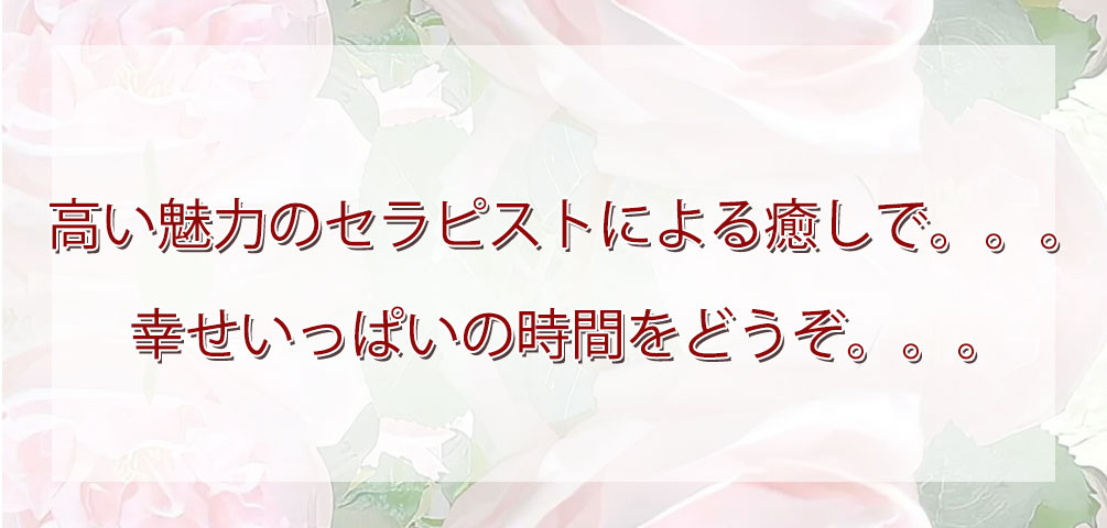 当店では、アロマオイルの効能と当店自慢のセラピストによるリンパマッサージの相乗効果による、癒しのひとときをお客様お一人お一人にお届けしております、自然で心やすらぐ優美な香りを、施術中はもちろんご帰宅お休みになってから翌日朝目覚めでまで楽しんで頂けます、どうぞゆっくりご堪能ください。